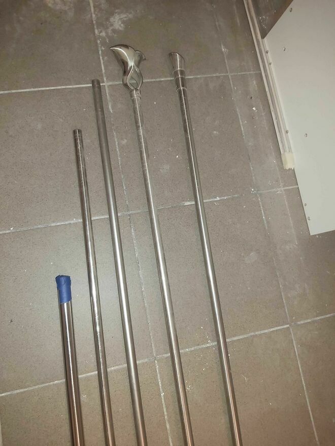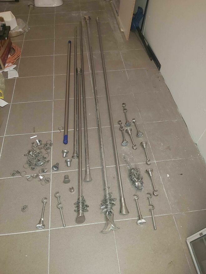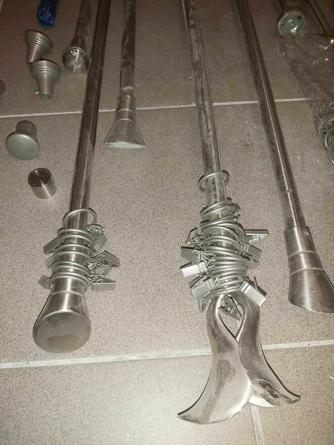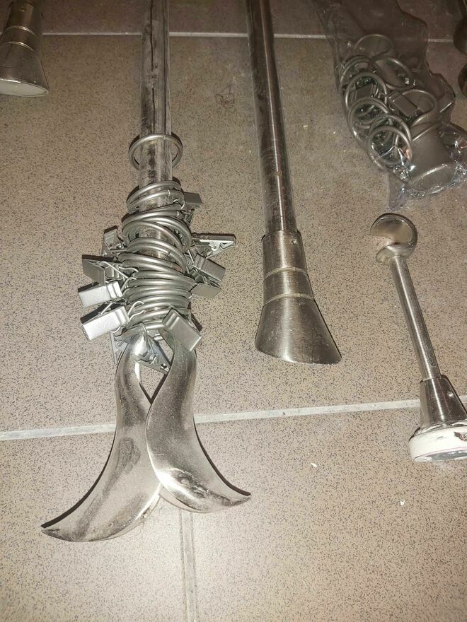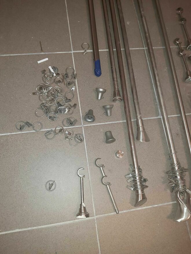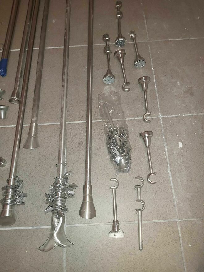 Karnisze jak NOWE pełne 3 komplety z końcówkami prostymi, źabkami, uchwytami ściennymi.Rury różnych długości: 200 , 180 , 160 , 120cm