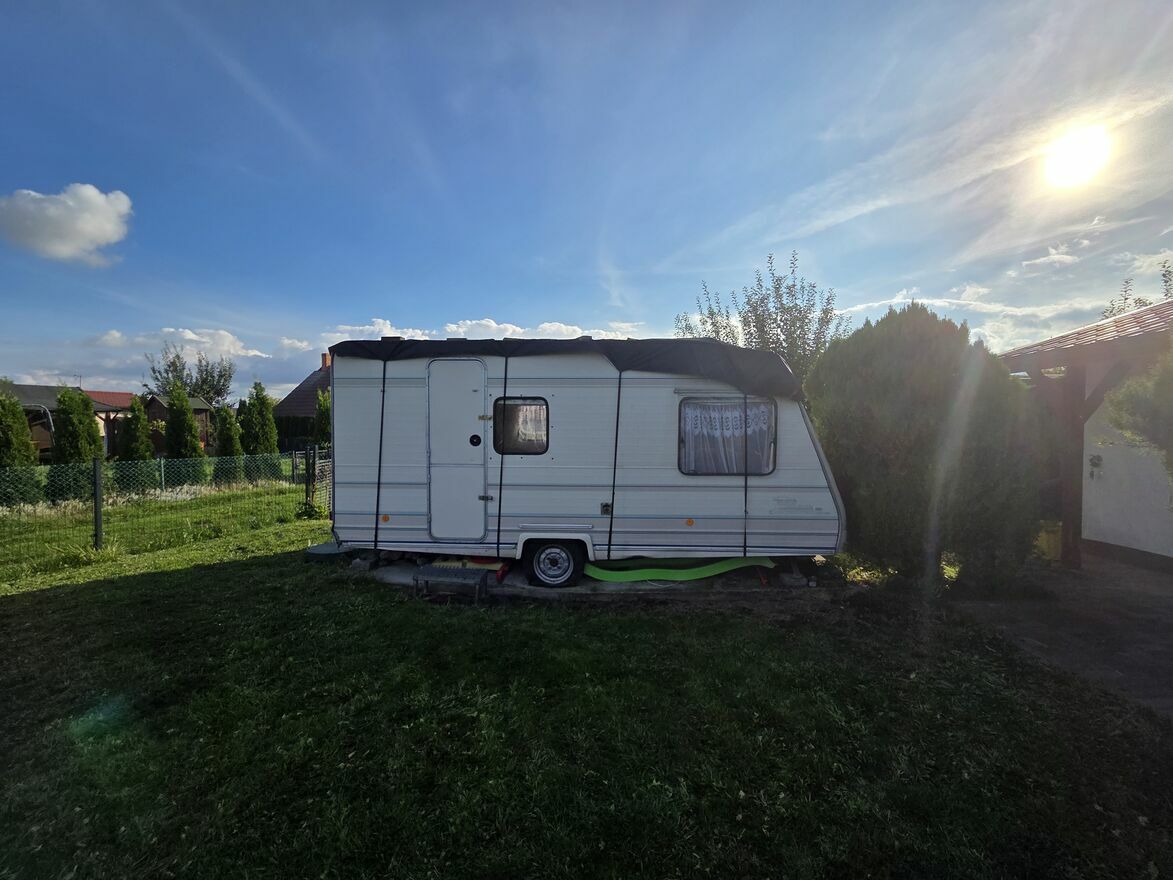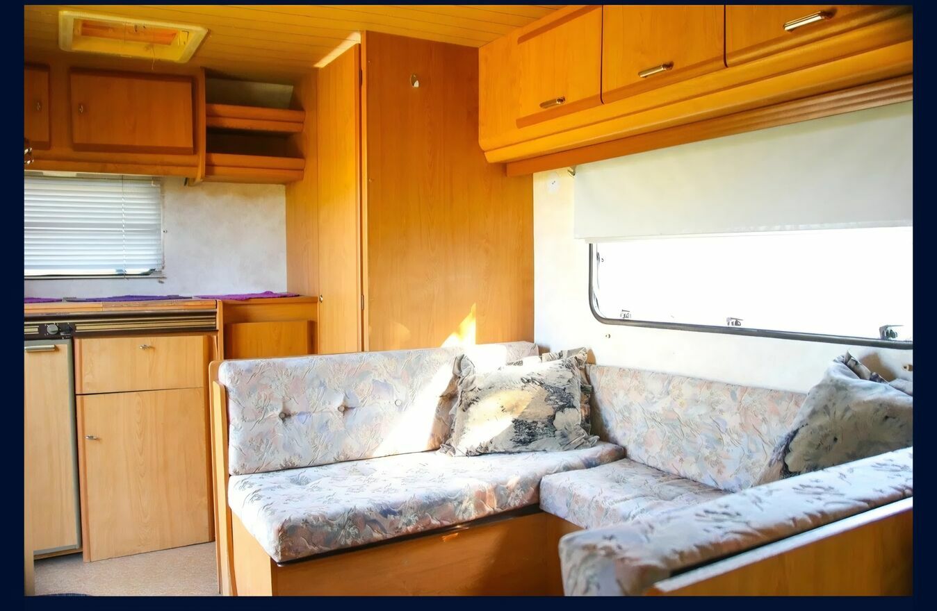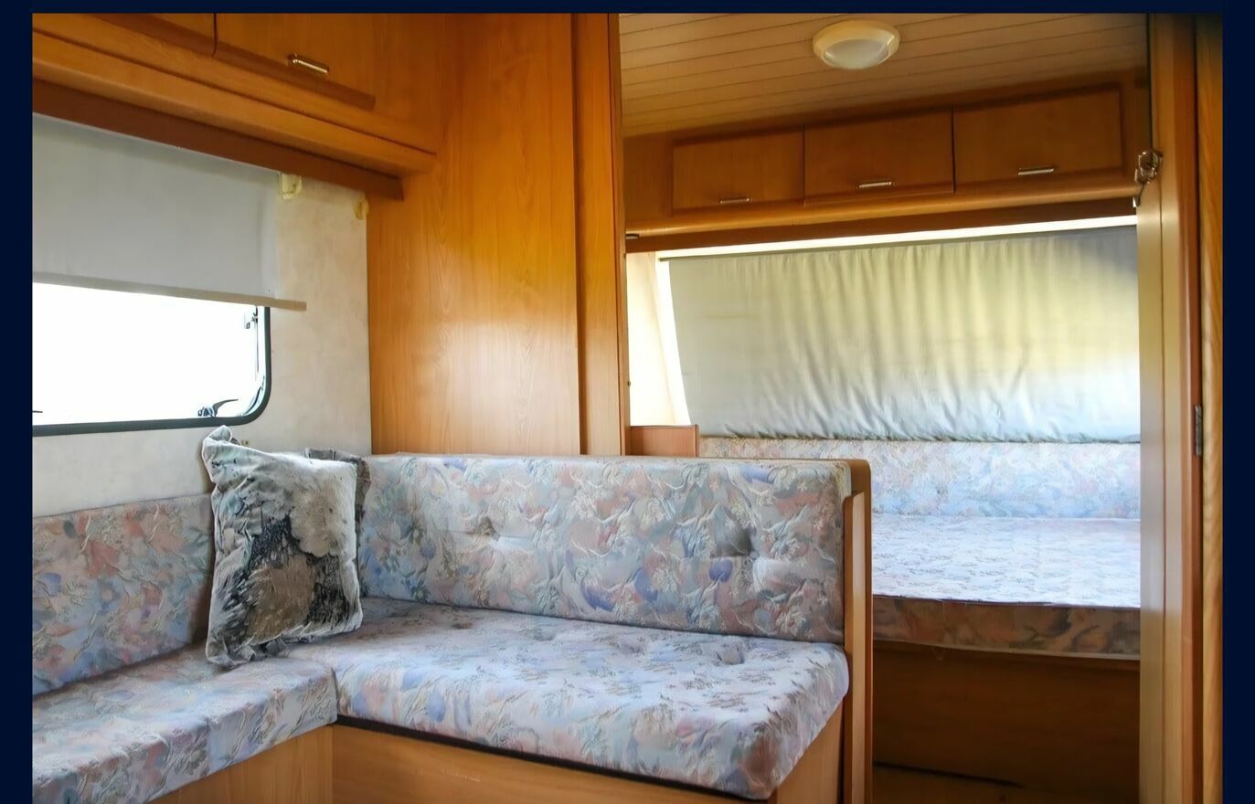 x przyczepa kempingowa w której znajdują sie 2 duże łóżka,