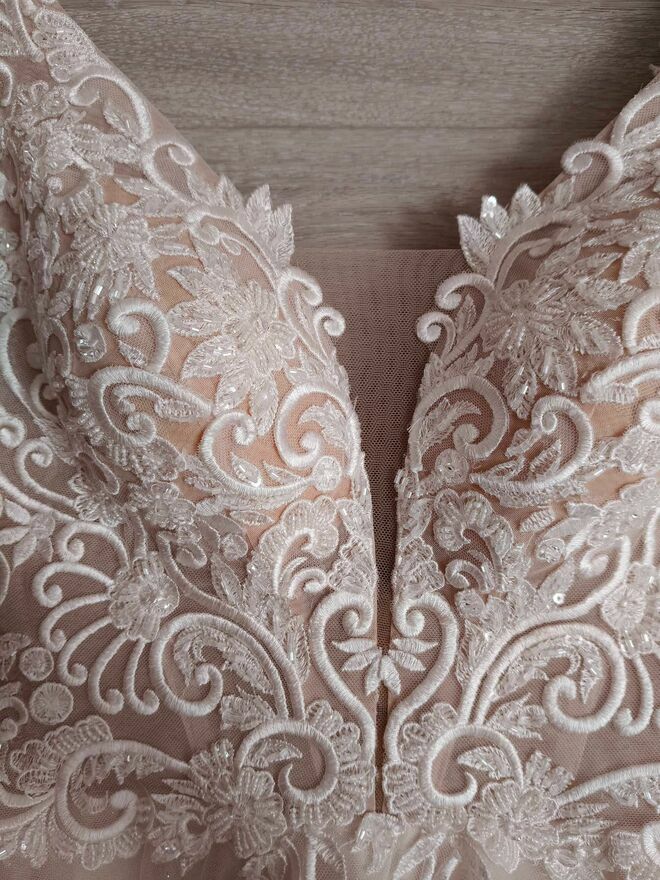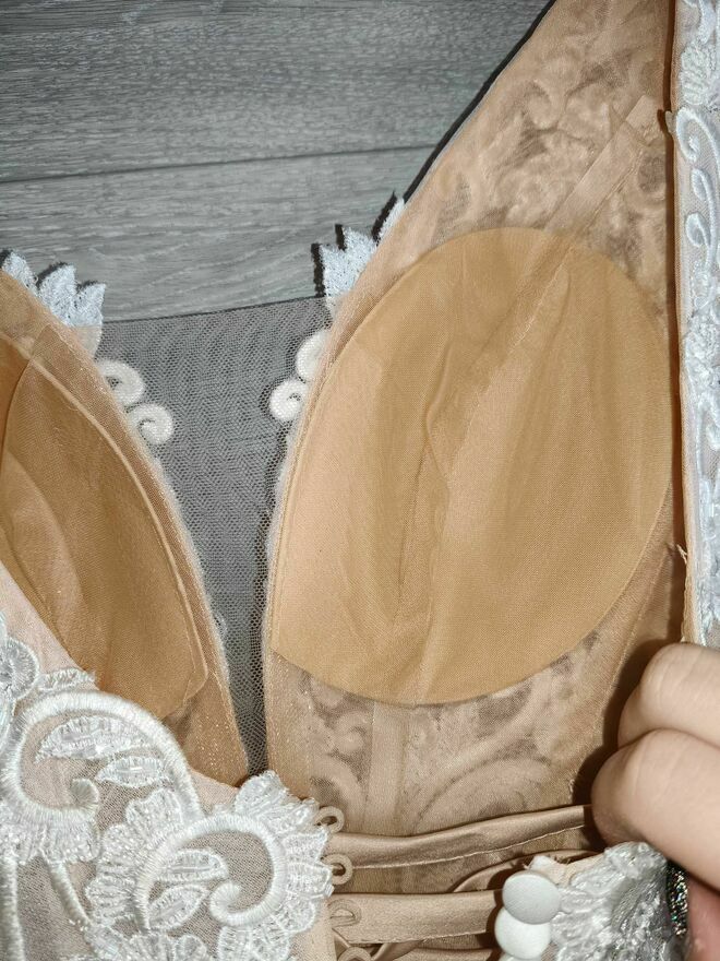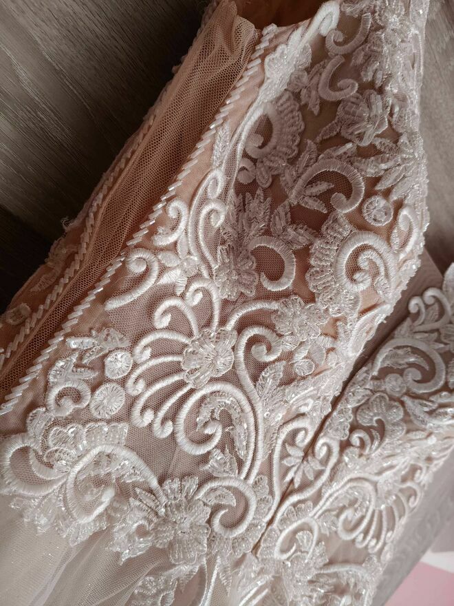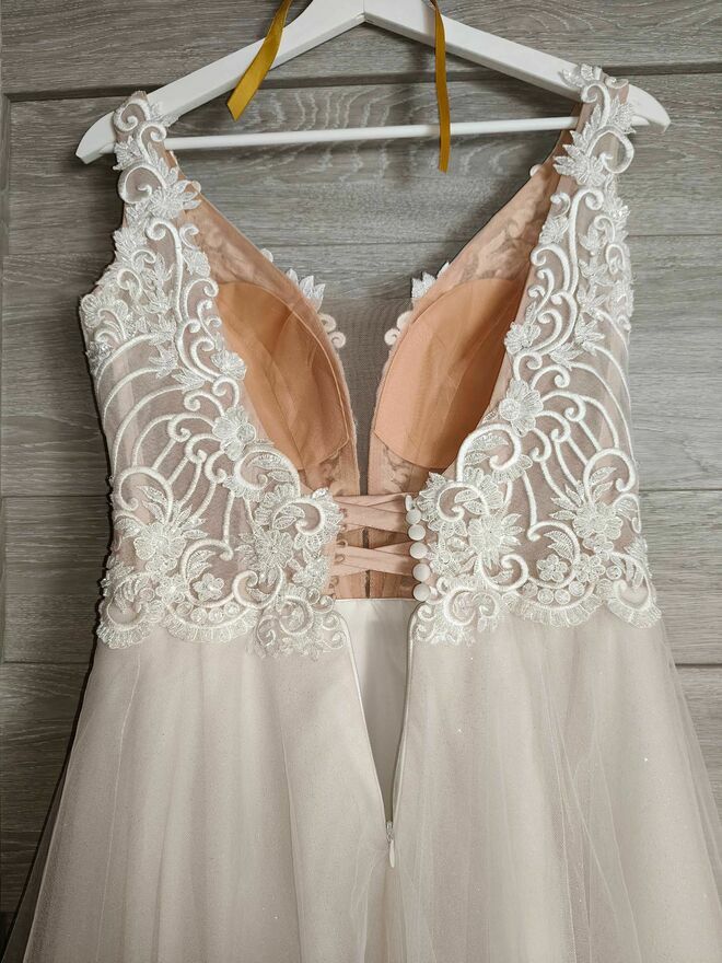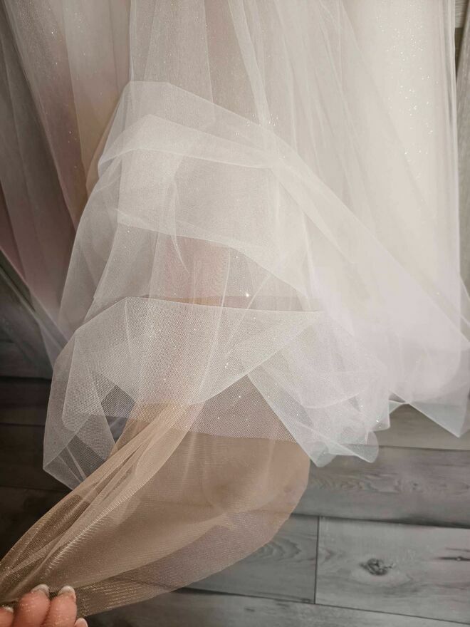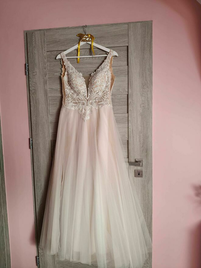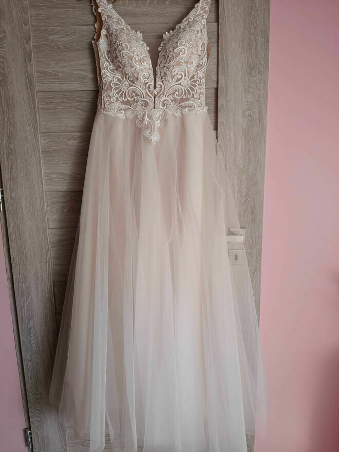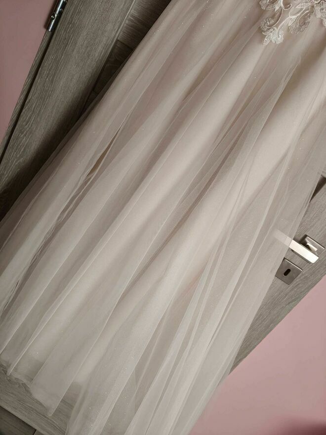 Witam. Na sprzedaż posiadam śliczną suknię ślubną rozmiar 36-38. Suknia założona raz w dniu ślubu. Suknia składa się z 4 warstw cienkiego tiulu, warstwy sztywnej siateczki, która nadaje objętości i kształtu oraz kremowej halki. Góra sukni gorsetowa, usztywniana z wszytymi miseczkami. Ozdobiona połyskującymi kryształkami. Suknia posiada ukryte wiązanie, które wysmukla i formuje talię. Zapinana na drobne guziczki i suwak.Klaudia